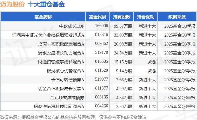 根据2025基金Q3季报公募基金重仓股数据,重仓该股的公募基金共14家,其中持有数量最多的公募基金为中欧基金的中欧成长LOF。中欧成长LOF目前规模为21.03亿元,最新净值2.4186(1月15日),较上一交易日上涨0.93%,近一年上涨54.97%。该公募基金现任基金经理为王培 尹为醇。王培在任的基金产品包括:中欧创新成长灵活配置混合A,管理时间为2018年3月26日至今,期间收益率为99.13%;中欧启航三年混合A,管理时间为2019年12月24日至今,期间收益率为58.12%;中欧责任投资混合A,管理时间为2020年9月10日至今,期间收益率为1.8%。尹为醇在任的基金产品包括:中欧创新成长灵活配置混合A,管理时间为2021年3月20日至今,期间收益率为-3.76%;中欧责任投资混合A,管理时间为2022年7月7日至今,期间收益率为10.92%;中欧成长领航一年持有混合A,管理时间为2022年7月7日至今,期间收益率为14.14%;
