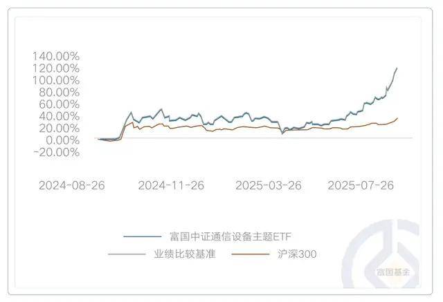 注:富国中证通信设备主题ETF成立于2024/06/28,业绩比较基准为中证通信设备主题指数收益率。自基金合同生效起至今2025/06/30的基金份额净值增长率(及同期业绩比较基准收益率为28.47%(29.35%),数据来自基金定期报告,截至2025/06/30。期间基金经理变动情况:苏华清(2024/06/28至今)。基金收益率不代表投资者实际收益率,基金份额净值仅为每份额基金产品的净资产。基金历史业绩不构成对未来业绩的保证。
